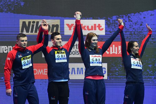 Despite still being only 18 years old Anderson wasn’t fazed in the slightest, swimming an incredibly mature race. Touching fourth at the turn, the freestyler let rip on the way back and with the crowd going wild she overhauled the Russians in the final few metres to snatch bronze by a tenth of a second.Mixed Medley Relay Gwangju Davies Guy Peaty Anderson